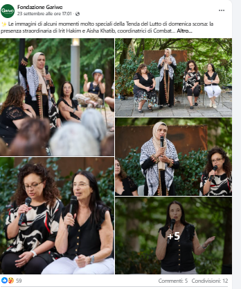 Significativo l’intervento di Irit Hakim (israeliana)e Aisha Khatib (Palestinese), coordinatrici di Combatants for Peace, movimento congiunto israeliano-palestinese fondato nel 2006, impegnato nella lotta non violenta contro l’occupazione israeliana e le violenze correlate, che hanno portato la loro testimonianza in cui l’impegno politico scaturisce e s’intreccia al vissuto e all’esperienza personale.