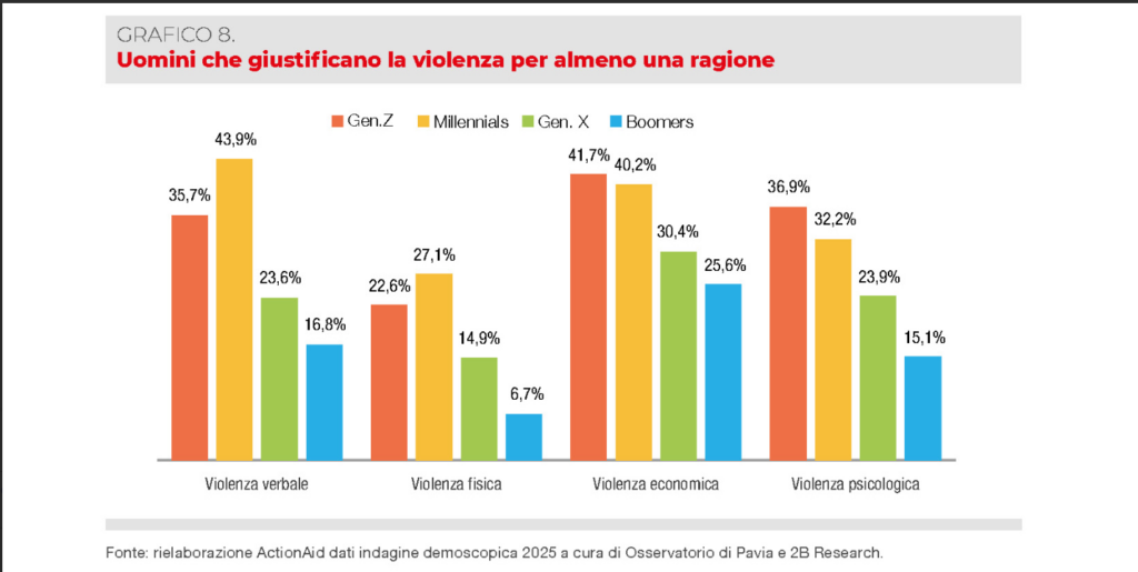 “La violenza economica è considerata accettabile da un uomo su tre, e lo è per quasi la metà dei maschi Millennial e quelli della Gen Z. Per uno su quattro la violenza verbale e quella psicologica sono ampiamente motivate da provocazioni e comportamenti “scorretti” delle donne. La maggioranza (55%) dei Millennials ritiene legittimo il controllo sulla partner, soprattutto in caso di tradimento o di mancata cura della casa e dei figli. Anche la violenza fisica è giustificabile per quasi 2 maschi adulti su 10.